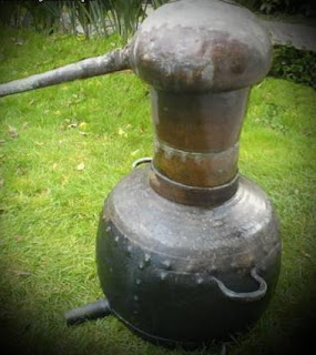 O alambique era de cobre, normalmente fabricado pelos latoeiros que havia na zona. A parte de cima, a cabeça, era afixada com a ajuda de uma massa de farinha (de centeio) com água, para vedar o vapor. Igual massa servia para vedar a água, em volta do tubo condensador, de que se fala a seguir.